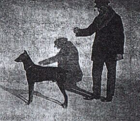 ![]() Učení psa stanouti na povel. (Obvodní insp. Matoušek s hnědým dobrmanem „Bojem".) |