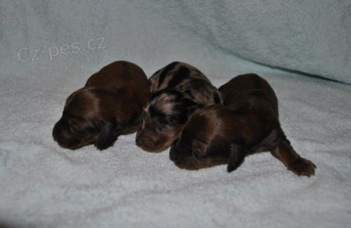 Jezevčík dlouhosrstý trpasličí, králičí , černý s pálením, červený, vzácně černě tygrovaný.Budou očkovaní odčervený, denně v kontaktu s malým dítětem.Více na www.jezevcici.ic.cz nebo 602970333