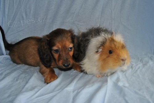 Jezevčík dlouhosrstý trpasličí, králičí, červený(5000Kč) a ve vzácné černě tygrované barvě(6000Kč).Jsou očkovaná odčervená , denně v kontaktu s malým dítětem.Pouze pejsci.Více na www.jezevcici.ic.cz nebo 602970333