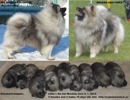 Prodám štěňata Německých špiců vlčích / keeshondů s PP po kvalitních rodičích. Předpoklad velice atraktivního, výstavního exterieru a nebojácných, hravých povah. Vynikající, ostražití hlídači vhodní k dětem i zvířatům. Impozantní vzhled, elegantní pohyb a atraktivní líbivé zbarvení upoutá na první pohled. Nejsou uštěkaní a nemají sklony k toulání. Lehce vychovatelní a dobře ovladatelní psi střední velikosti. Keeshond je veselý, nenáročný, inteligentní pes vhodný do rodin s dětmi i jako společník starších lidí. Má bohatou srst atraktivní stříbřité barvy - stříbrný chlupatý medvídek. Srst není náročná na údržbu- stačí vyčesat. Velice učenlivý, líbivý pes veselé povahy. Může být chován celoročně venku. Zdravý, otužilý, dlouhověký, nenáročný a přizpůsobivý pes. Čiperný hlídač, stále ve střehu, nic mu neujde. Vhodný ke všem psím sportům. Bezpečně ohlídá Váš dům i zahradu. Skvělý, veselý společník pro celou rodinu. Jako příkladný hlídač se drží u domu. Čiperný a hravý kamarád k dětem. Štěňata kvalitně odchovaná v rodinném prostředí s dětmi, psy i kočkami k odběru 2-3/2013. Budou očkovaná, čipovaná s Petpassportem a otužilá již celodobě zvyklá venku. Chov ani výstavy nejsou podmínkou. http://re-janmoravia.ic.cz , tel: 739965050