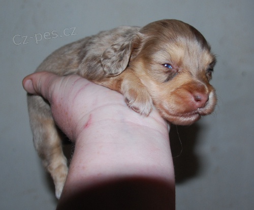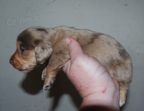 Bývalá CHS nabízí k prodeji tuto fenku dlouhosrstého trpasličího/králičího jezevčíka bez PP v barvě hnědé s pálením tygrované (tzv.čokotygřík). Fenečka se narodila 3.4. a do nového domova může odejít od 22.5.2014, kdy bude očkovaná a odčervená.