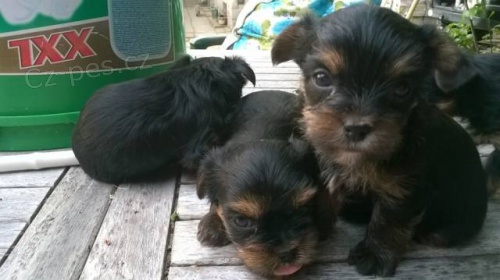 Jsme krásné jorkšíří slečny, krmené superprémiovými granulkami (v současné době nám panička sype do misek Arden grange a FirstMate) a když jsme hodné, dostaneme konzervičku Belcando. Chceme paničku (páníčka), kteří nás budou rozmazlovat a odpustí nám drobné rošťárny. Máme světlou, klidnou maminku bez PP, tatínka s PP, modrého, tříslového, temperamentního z chovu agiliťáků (ale on sám se aktivně agility nevěnuje, jeho panička má jiné zájmy). Byly jsme klidné a moc hodné, ale v poslední době se zdá, že nebudeme úplné gaučové povalečky, umíme i zlobit. Jsme moc krásné, s jemnými čumáčky, hravé, a současnou paničku si dokonale umíme omotat kolem tlapičky. Do nových domovů odejdeme odčervené, očkované, veterinárně ošetřené, s očkovacím průkazem, hračkou, balíčkem s krmivem pro první dny, naučené na čůrací podložku. Na fotkách jsou i rodiče štěňátek. Otec je dlouhosrstý, matka nakrátko ostříhaná. Narozené jsme 29.4.2015. Cena: 7000. Telefon: 704411544, e-mail: quadrangularis@seznam.cz
