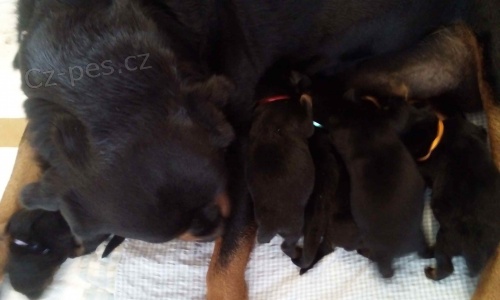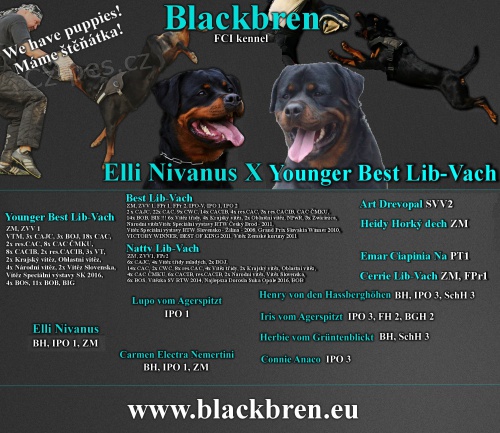 Rotvajler - chov. stanice Blackbren zadá štěňátka RTW s PP ze spojení Elli Nivanus x Younger Best Lib-Vach. Oba rodiče jsou temperamentních vyrovnaných povah, neagresivní vůči lidem ani zvířatům. Psi budou vhodní na sport, službu i jako výborný společník do rodiny. K odběru začátkem prosince. Tel.: 602707777, www.blackbren.eu